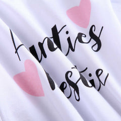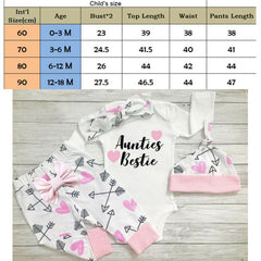 100% brand new and high quaility A set of 4pcs: romper+pants+hat+headband Aunties Bestie print on romper Suitable for casual ,Xmas ,gift,etc 4pcs only,any other accessories not included Material:100% Cotton Color:White and Pink Size:60/70/80/90 Note: 1. The recommended age is just for your reference. Please check the measurements to choose the right size for your baby! Package Includes: